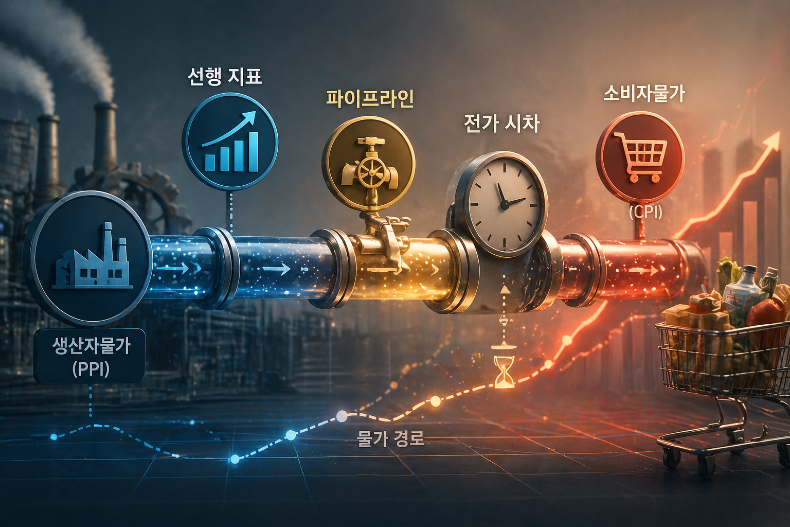 물가 충격은 순서대로 전달됩니다. 수입물가 → 생산자물가 → 소비자물가. 이 파이프라인을 이해하면 지금 소비자물가 2.2%가 왜 안심할 수 없는 숫자인지 보입니다.